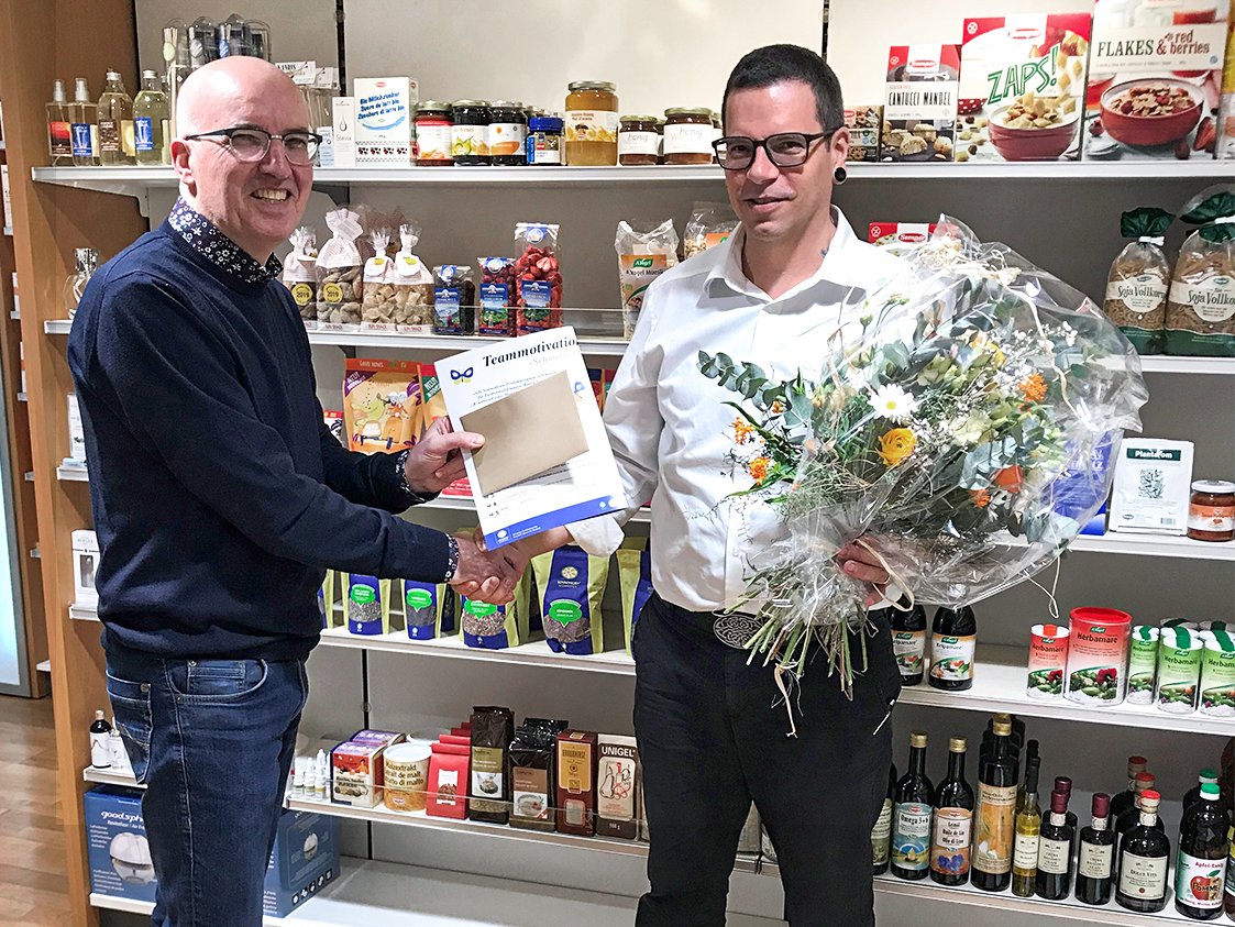 Mit dem Slogan «Schmetterlinge im Darm» führte Sonnenkorn bei allen Fachgeschäften im November 2019 einen attraktiven Wettbewerb durch. Als Gewinner der 300 Franken für die Teamkasse durfte Urs Hüttinger von Sonnenkorn Adrian Roth (rechts) aus der Dropa Drogerie in Wangen a. A. den Preis übergeben. Wir gratulieren herzlich und danken allen Beteiligten für die Teilnahme und Unterstützung beim Verkauf von Sonnenkorn-Produkten.